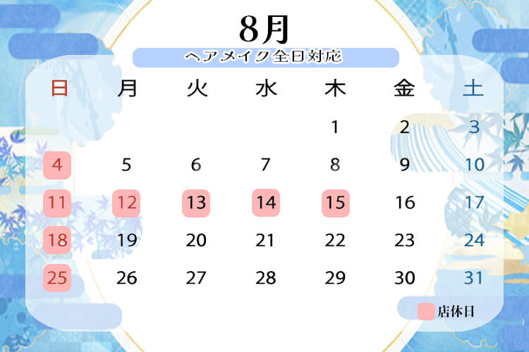 8月は、毎週日曜日を店休日とし、