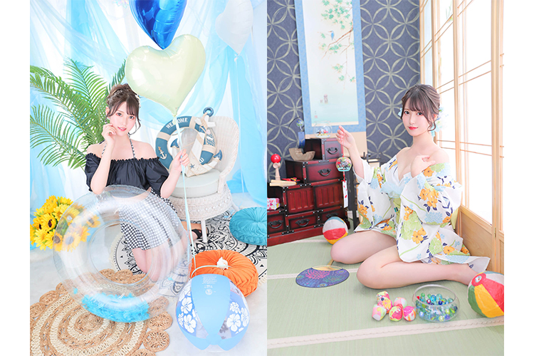 モデルさんが着用しております、浴衣・水着・髪飾りなど当店でレンタル可能です♪